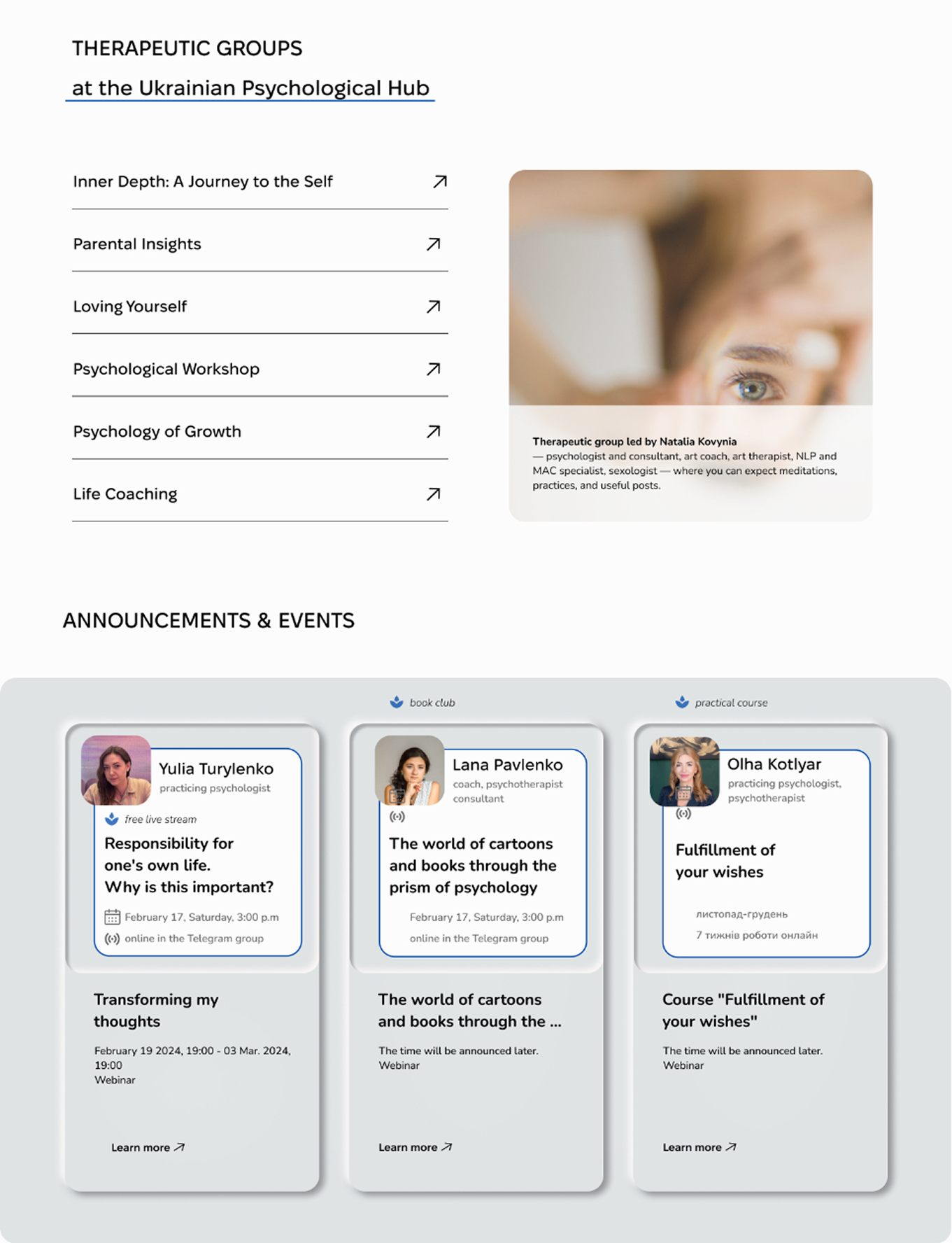 For the hero section, I created a collage symbolizing life's balance, with a prominent CTA button. The 'Therapeutic groups' section, a new service, uses an accordion for easy navigation, allowing users to view group details and access them directly. I utilized WIX tabs and JavaScript for this feature. The 'Announcements and Events' section was updated with a neumorphic design using custom CSS for a modern look. The Specialists Page was divided into two sections for psychologists and physical health specialists, with categories for easier selection. I also redesigned the About Us and Specialist’s Profile pages, implementing a new CRM system.